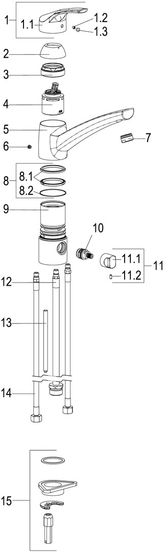 Kartusche 44 mm, mit Heißwasser- und Durchflussbegrenzer, Werkstoffe nach TrinkwV und UBA, Hebel Metall, Flexschläuche 3/8" DIN DVGW, Strahlregler Durchflussklasse A, mit Schnellbefestigung