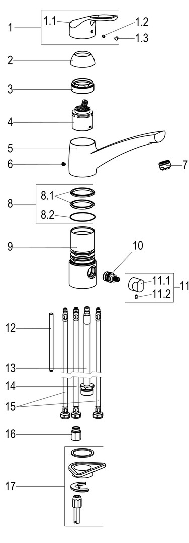 Kartusche 44 mm, mit Heißwasser- und Durchflussbegrenzer, Werkstoffe nach TrinkwV und UBA, Hebel Metall, Flexschläuche 3/8" DIN DVGW, Strahlregler Niederdruck, für drucklose Heißwasserbereiter, mit Schnellbefestigung, Durchflussbegrenzer 5 l/min