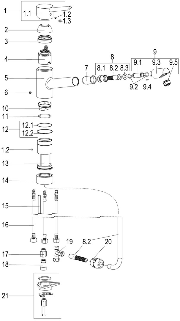 Kartusche 44 mm, mit Heißwasser- und Durchflussbegrenzer, Werkstoffe nach TrinkwV und UBA, Hebel Metall, Flexschläuche 3/8" DIN DVGW, Strahlregler Niederdruck, für Standmontage, für drucklose Heißwasserbereiter, mit Metallbrauseschlauch, eigensicher gegen Rückfließen, mit Schnellbefestigung, Durchflussbegrenzer 5 l/min