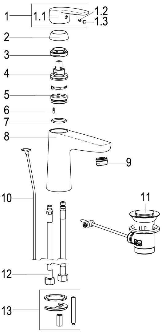 Kartusche 35 mm offen, mit Heißwasser- und Durchflussbegrenzer, Werkstoffe nach TrinkwV und UBA, Hebel Metall, Flexschläuche 3/8" DIN DVGW, Strahlregler 7 l/min, Geräuschprüfzeichen PA-IX 7198/IO, für Standmontage, mit Ablaufgarnitur 1 1/4", mit Befestigungssatz