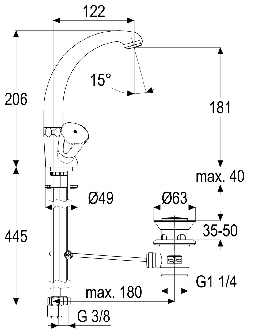 | Aufbauhöhe Unterkante Hahnauslass | 181 mm |