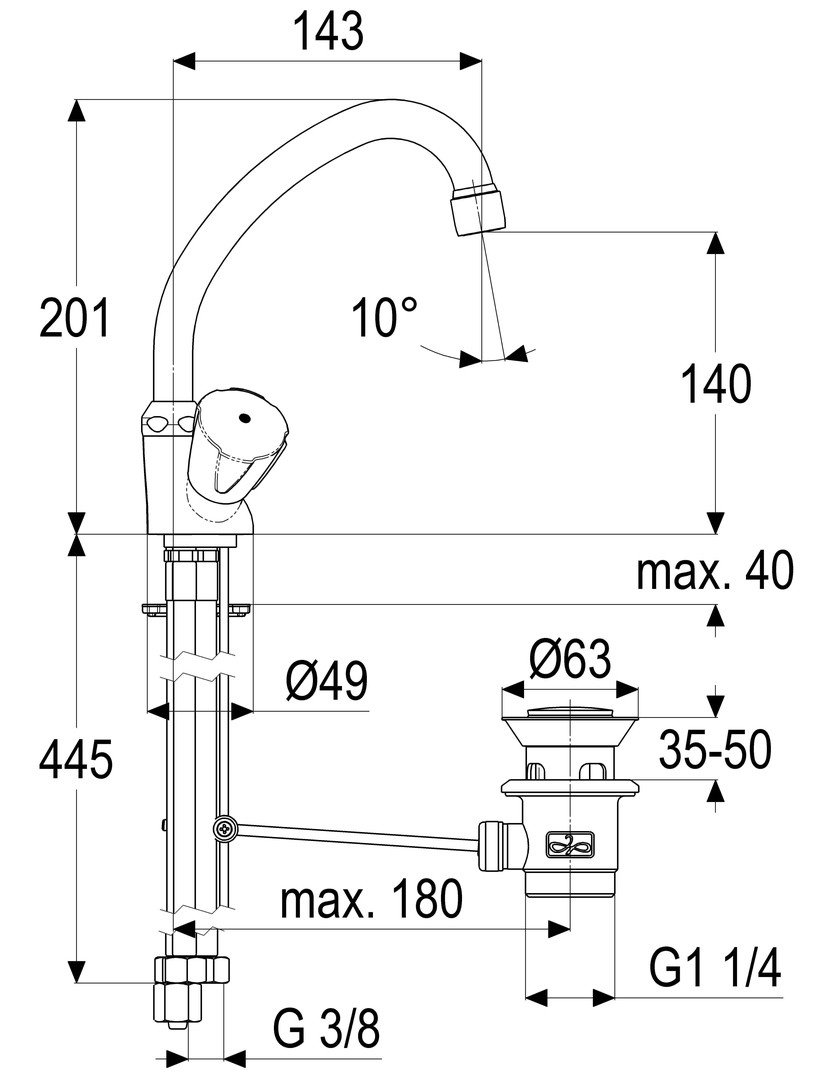 | Aufbauhöhe Unterkante Hahnauslass | 140 mm |