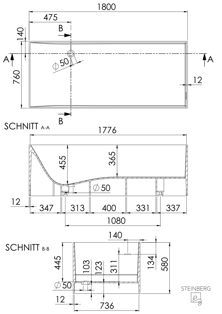 Serie 490 Freistehende Badewanne eckig, mit Überlauf, inkl. Ablaufgarnitur, Ablaufschlauch, Schwamm, justierbare Füße 4x, 1800mm x 760mm x 580mmaus solid surface