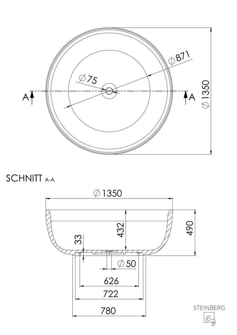 Serie 490 Freistehende Badewanne rund, mit Überlauf, inkl. Ablaufgarnitur, Ablaufschlauch, Schwamm, justierbare Füße 4x, ø 1350mm x 490mm, aus Solid Surface