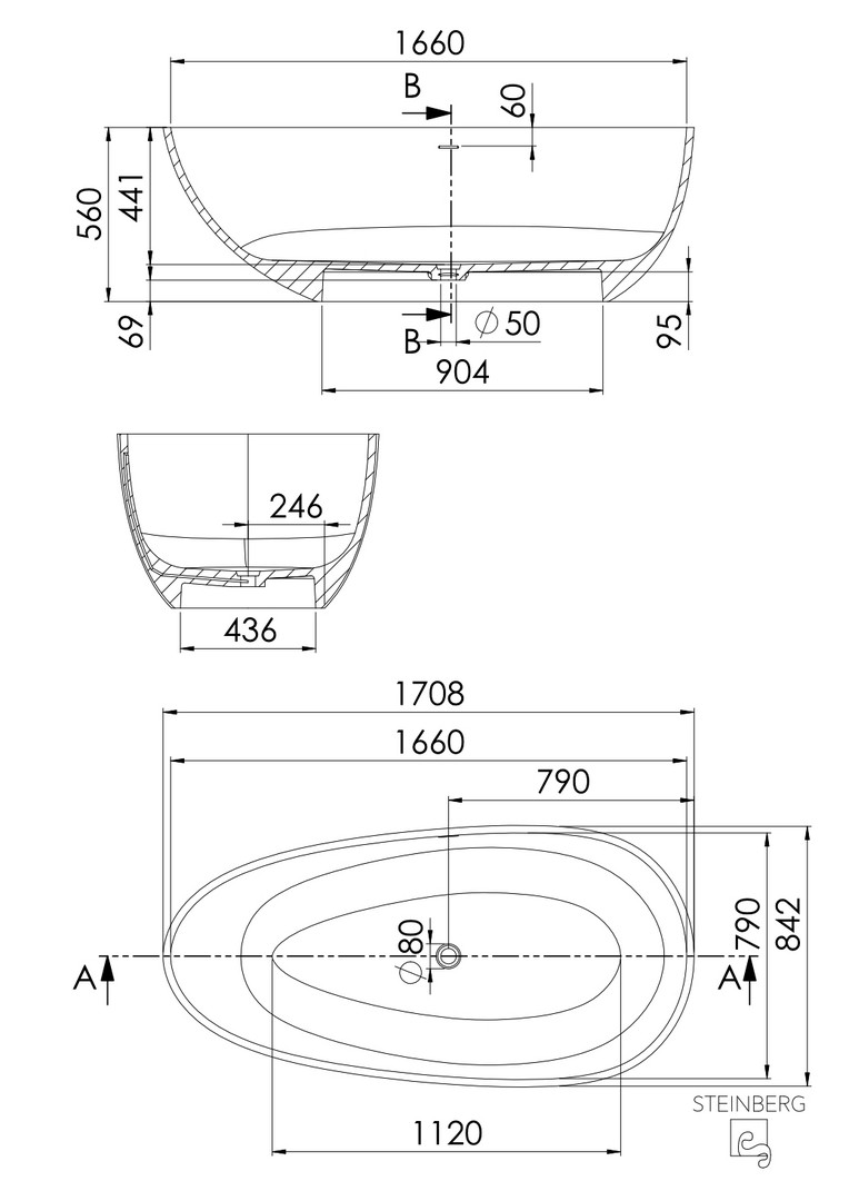 Serie 540 Freistehende Badewanne aus Solid Surface, inkl. Ablaufgarnitur in chrom, inkl, Ablaufschlauch DN 32, inkl. Siphon, oval, dark pearl