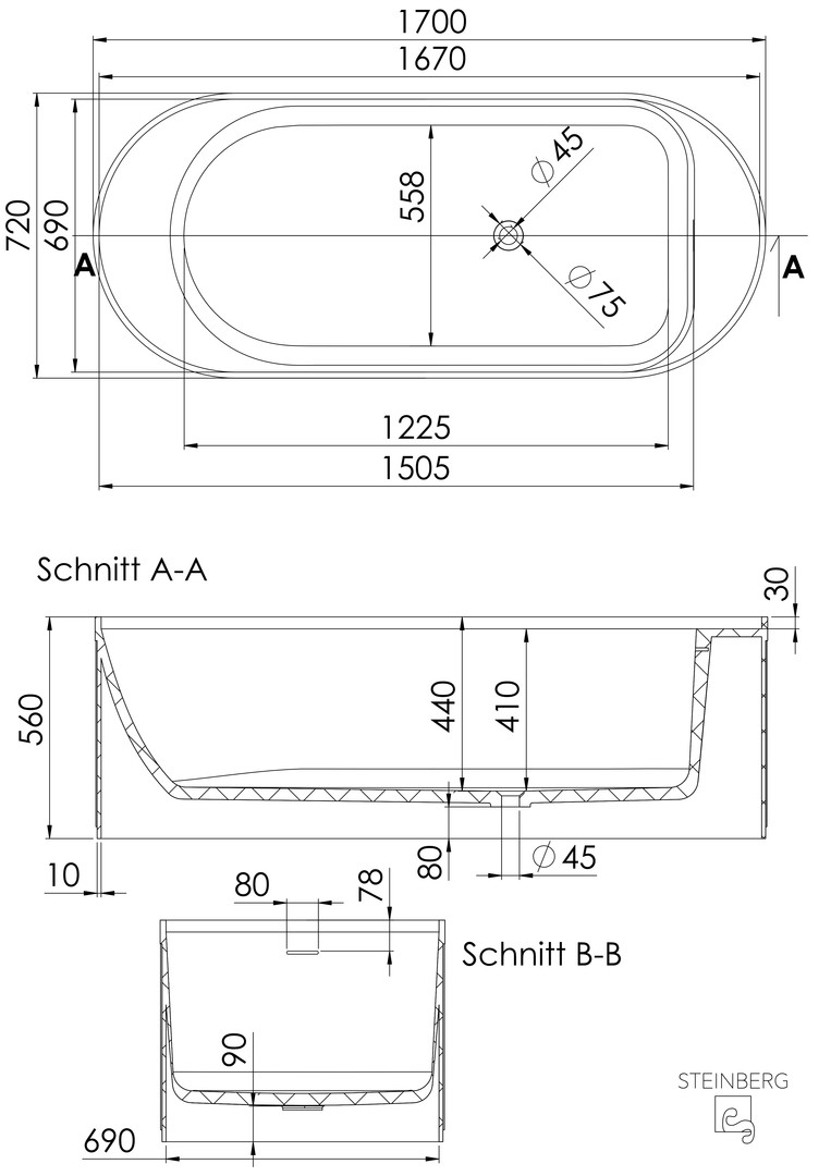 Serie 740 Freistehende Badewanne 1710x720x560, mit Ablaufgarnitur, matt white / matt black
