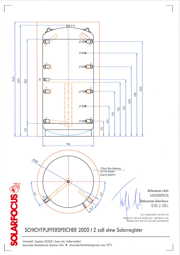 aus Stahlblech S235JR nach DIN 4753 gefertigt, Muffenlänge 100 mm, außen lackiert, Schichtladeeinheit im Heizungsrücklauf, Schichttrennplatte sowie hochgezogene Rohrkrümmer zur besseren Speicherausnutzung, alle hydraulischen Anschlüsse 6/4" IG mit Einström-Prallblech zur Erhaltung der Schichtung, Sensor-Tauchhülsen-Anschlüsse 1/2" IG, max. Betriebsdruck: 3 bar, max. Betriebstemperatur: 95 °C, Abmessungen: 790 x 2040 mm, Gewicht: 132 kg, ohne Isolierung