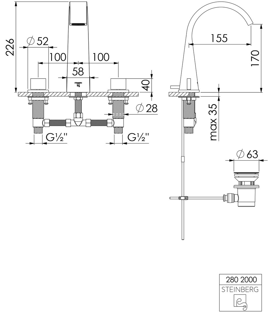 Steinberg 3-Loch-Waschtischarmatur Serie 280 Ausladung 155 mm, mit 90Grad Keramikventilen, chrom