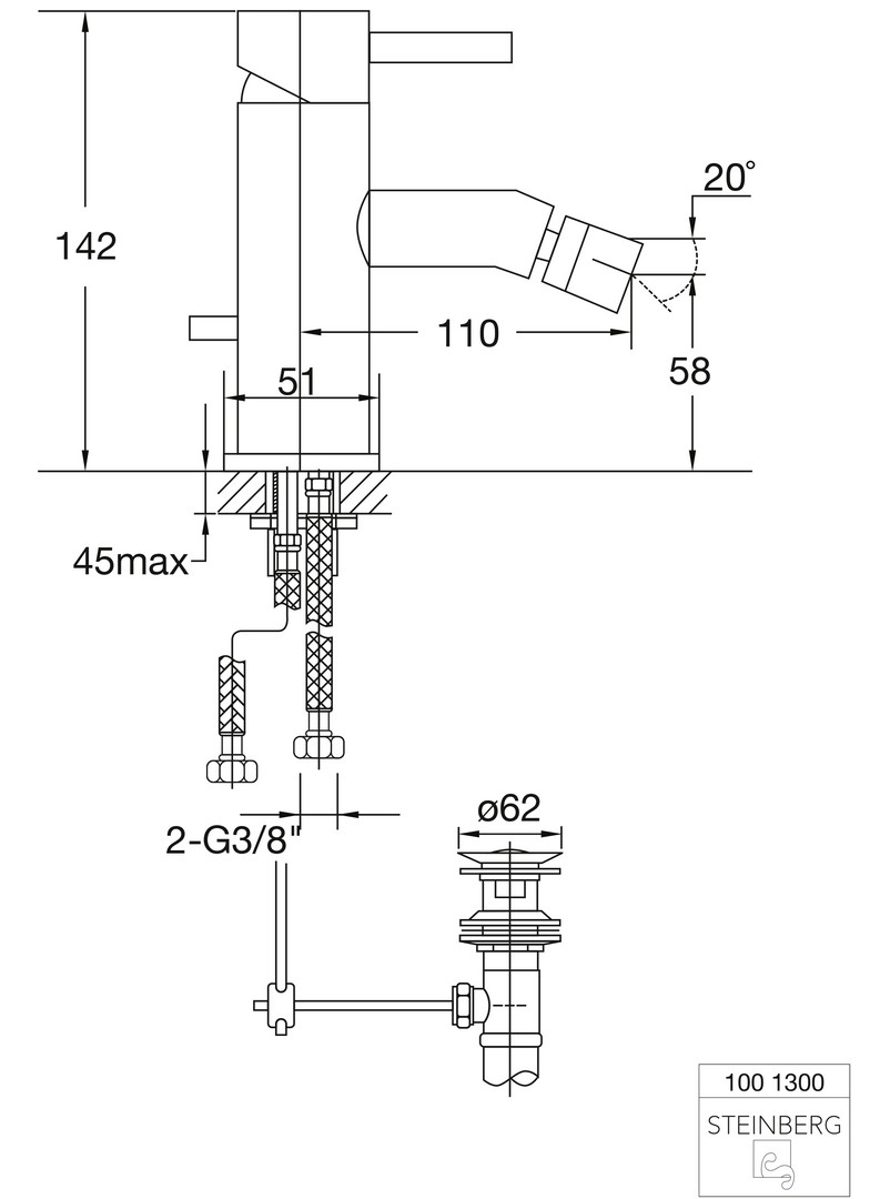 Steinberg Bidet-Einhebelmischer Serie 100 Ausladung 110mm, mit Ablaufgarnitur, chrom W323532