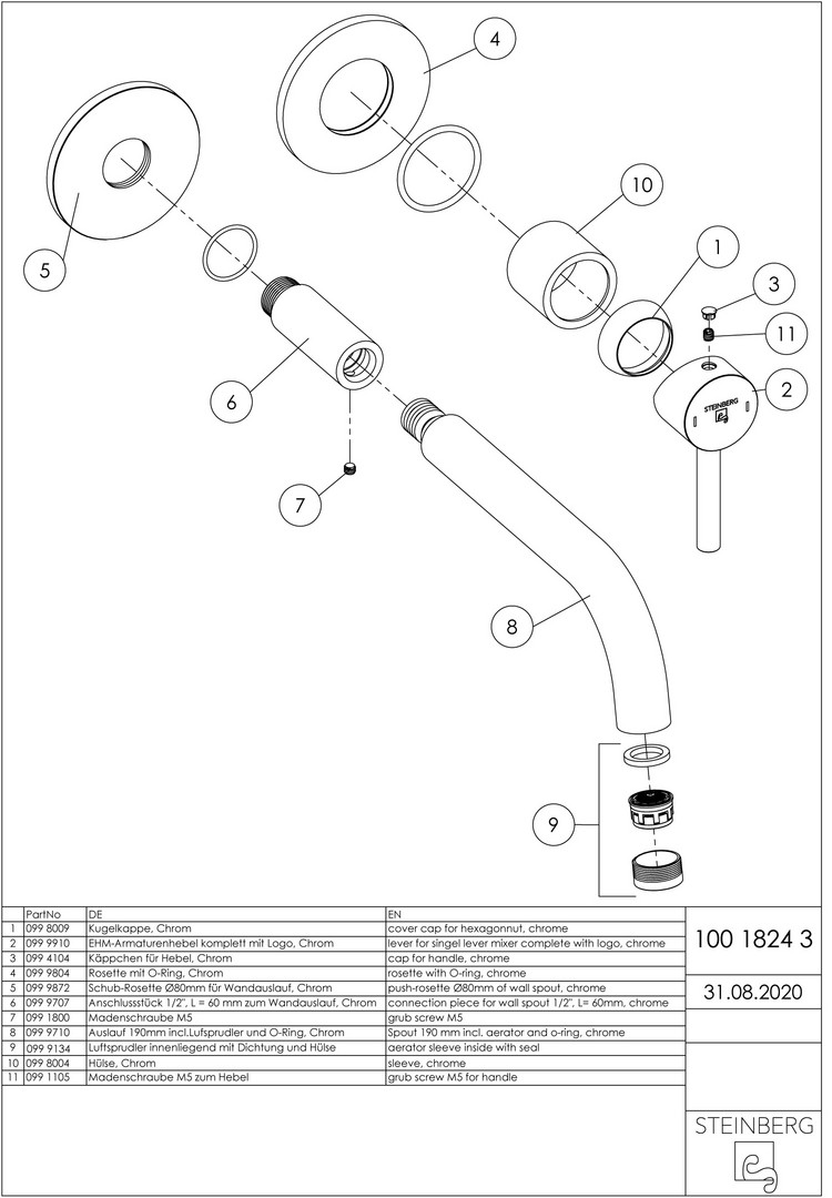 Steinberg Fertigmontageset Serie 100 Waschtisch-Einhebelmischer, Wandmontage, Ausladung 245 mm, chrome W323573