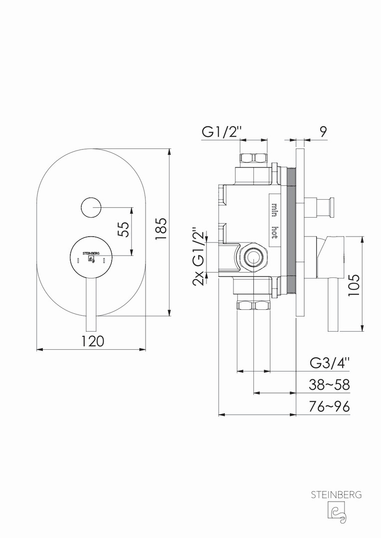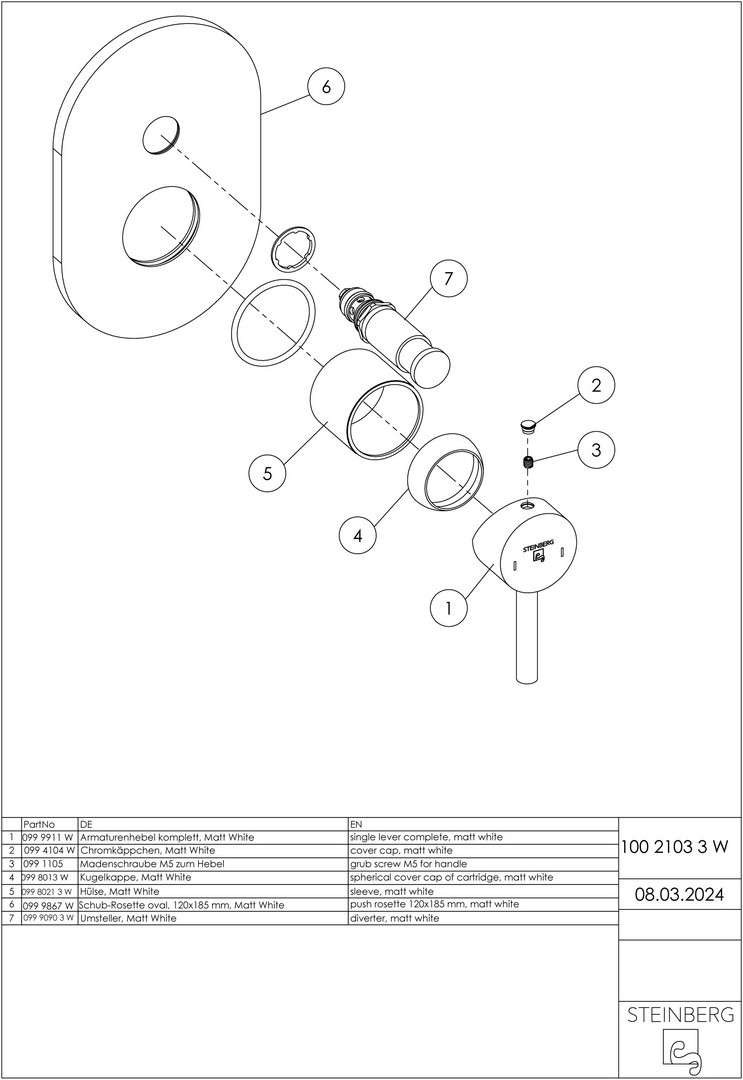 Steinberg Fertigmontageset Serie 100 für Wanne/Brause-Einhebelmischer, mit Umsteller, chrom, matt white