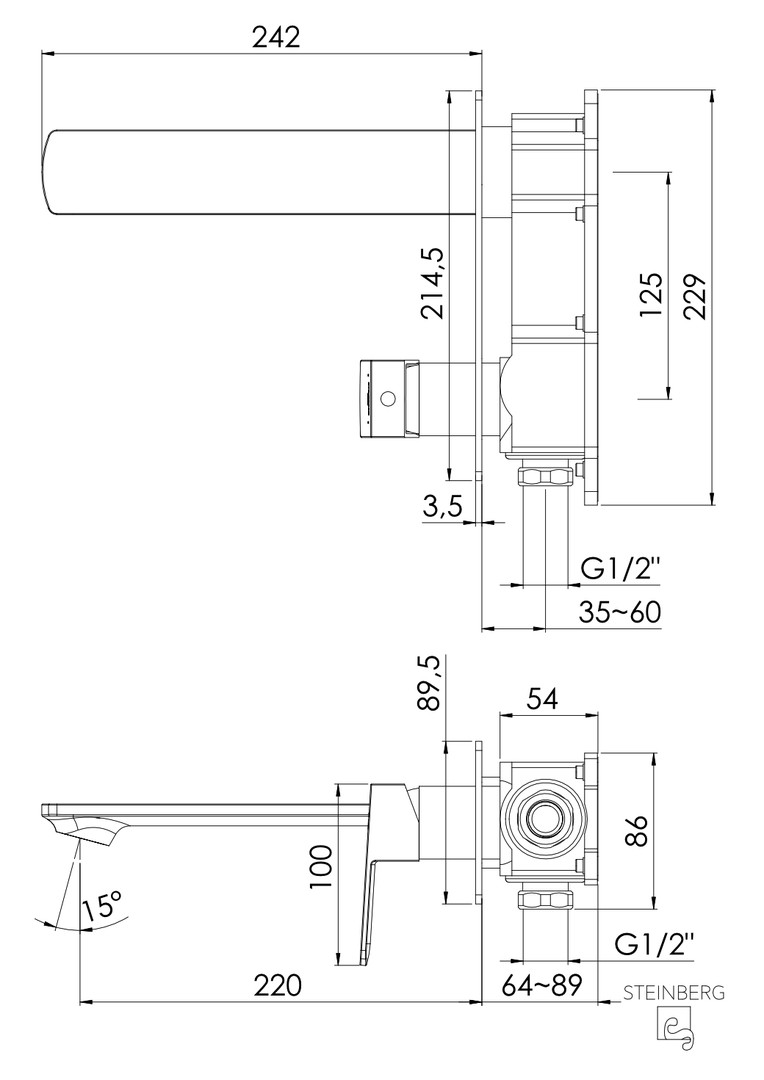 Steinberg Fertigmontageset Serie 342 UP-Waschtisch-Einhebelmischer, Ausladung 220mm, Wandmontage, Matt Black