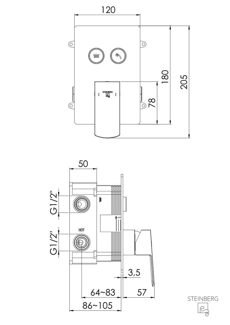 Steinberg Fertigmontageset UP-Wanne-/Brause-Einhebelmischer, Wandmontage, eckig, Matt Black