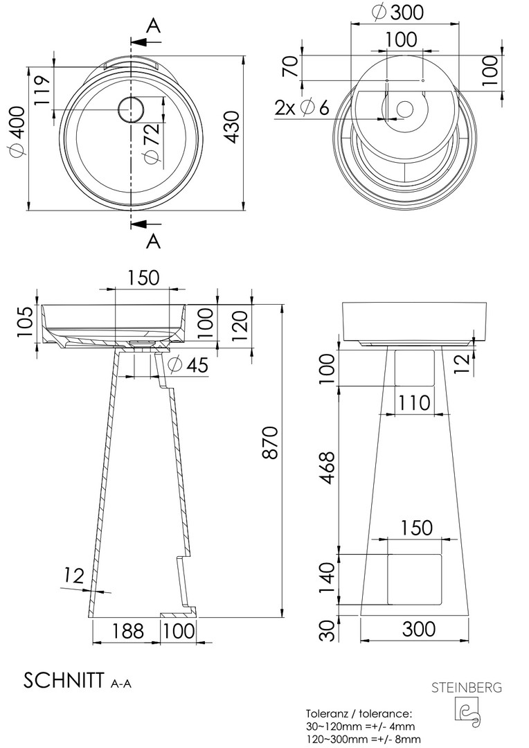Steinberg Standwaschtisch Serie 445 d= 400x870mm, matt white