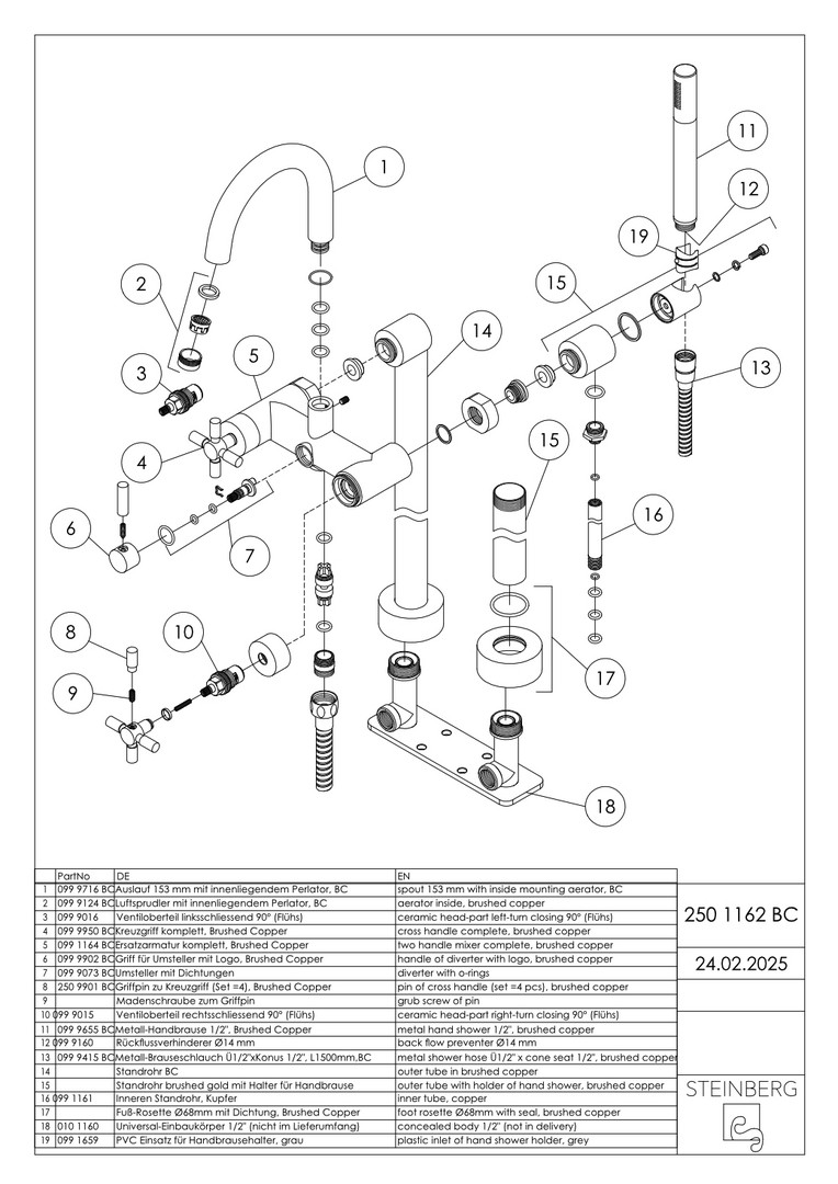 Steinberg Wannen-Zweigriff-Armatur Serie 250 Ausladung 153mm, freistehende Montage, brushed copper