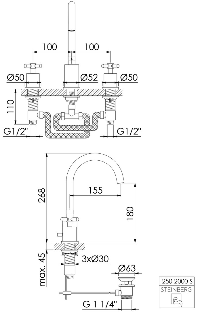 Steinberg Waschtisch-3-Loch-Armatur Serie 250 Ausladung 150mm, mit Ablaufgarnitur 1 1/4", chrom W323397