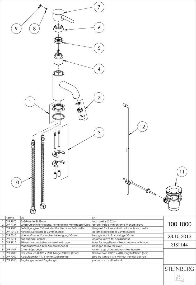 Steinberg Waschtisch-Einhebelmischer Serie 100 Ausladung 100mm, mit Ablaufgarnitur 1 1/4", chrome W323494