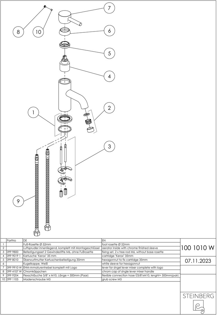 Steinberg Waschtisch-Einhebelmischer Serie 100 Ausladung 100mm, ohne Ablaufgarnitur, matt white
