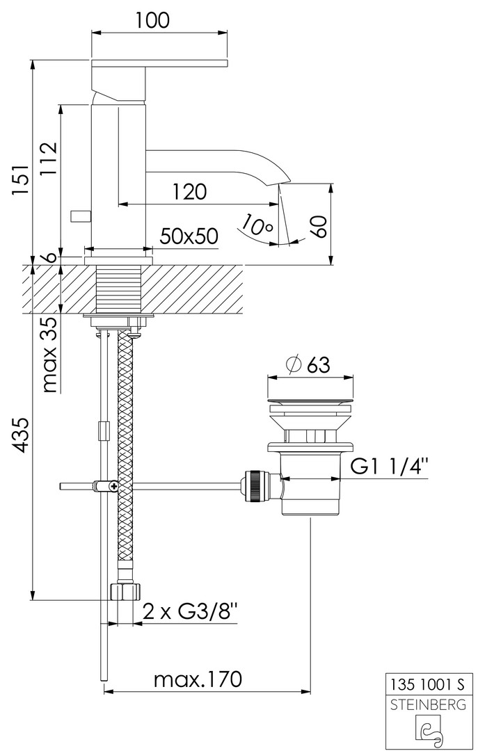 Steinberg Waschtisch-Einhebelmischer Serie 135 Ausladung 120mm, mit Ablaufgarnitur 1 1/4", Matt Black
