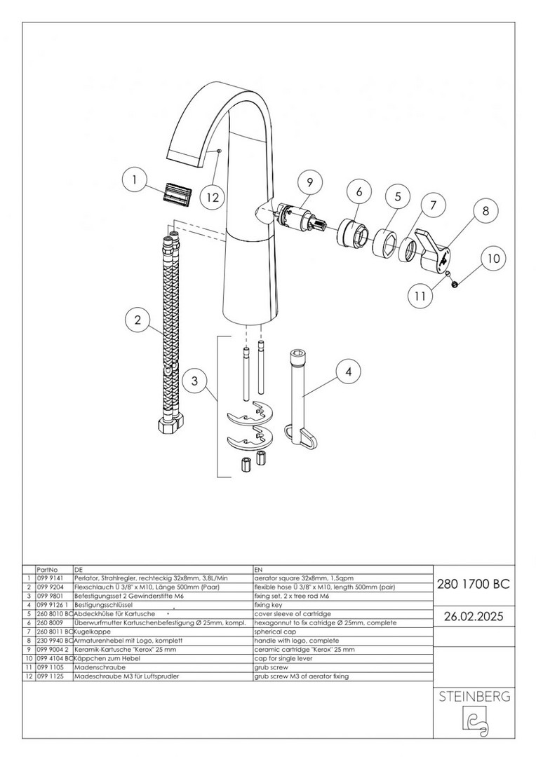 Steinberg Waschtisch-Einhebelmischer Serie 280 Ausladung 155mm, ohne Ablaufgarnitur, chrome W323478
