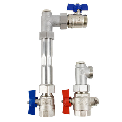 mit Wärmezählerverrohrung bestehend aus zwei 90°-Winkelanschlussstücken mit 1/2" Stopfen im Vorlauf, zwei Kugelhähnen (Griff rot für VL bzw. blau für RL) mit Fühleranschluss für direkteintauchende Fühler (Ø 5-5,2 mm, M 10 x 1 IG) im Vor- und Rücklauf (2F), zusätzlicher Kugelhahn (Griff blau) im Rücklauf, WMZ-Distanzrohr L=110 mm, Fühlereinbaustück austauschbar (Fühlereinbaustück Ø 6 mm M 12 x 1 AG, Werk-Nr. 55-330024), Primäranschluss 3/4" (1") IG