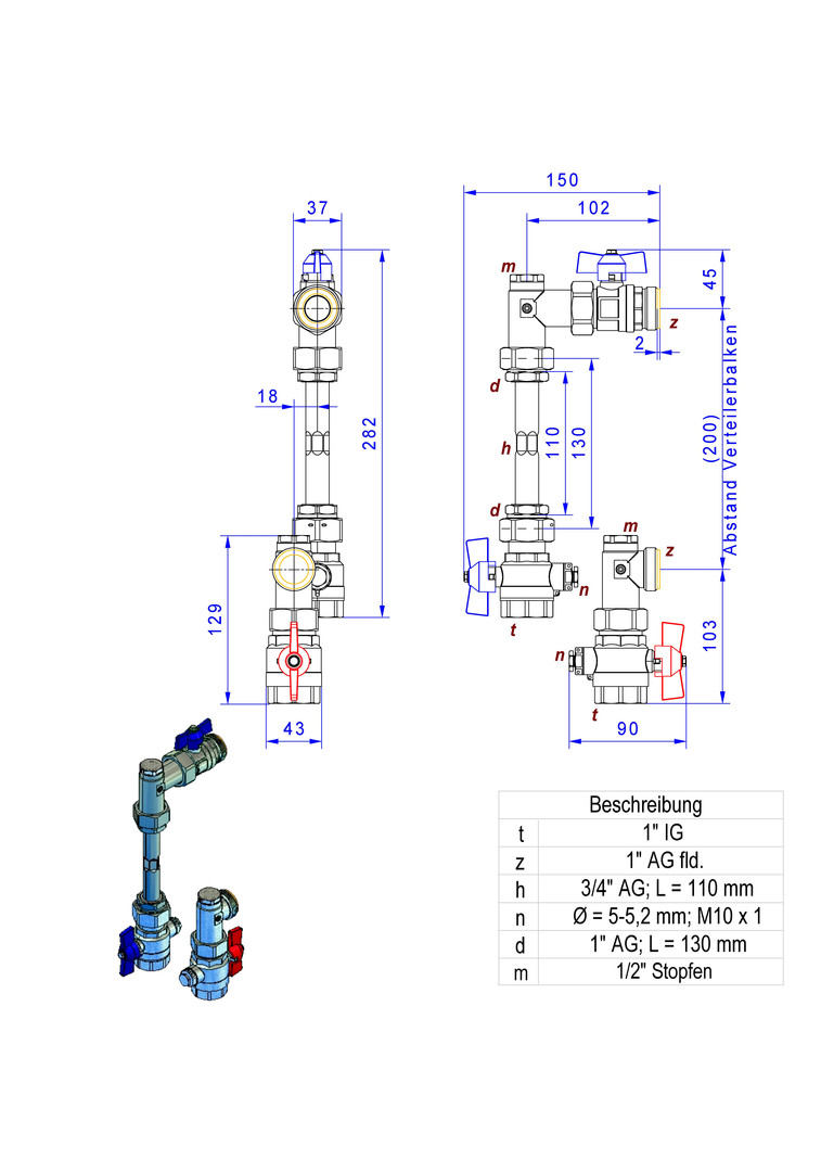 passend für e-class Heizkörper- und Flächenheizungs-Anschlussverteiler, mit Anschlussgarnitur mit Absperrkugelhähnen und Wärmezählereinbaustrecke, max. Betriebsdruck 6 bar, max. Betriebstemperatur 80 °C, Länge 266 mm, Kvs-Wert 5,67 qm/h, Primäranschluss G 1 IG