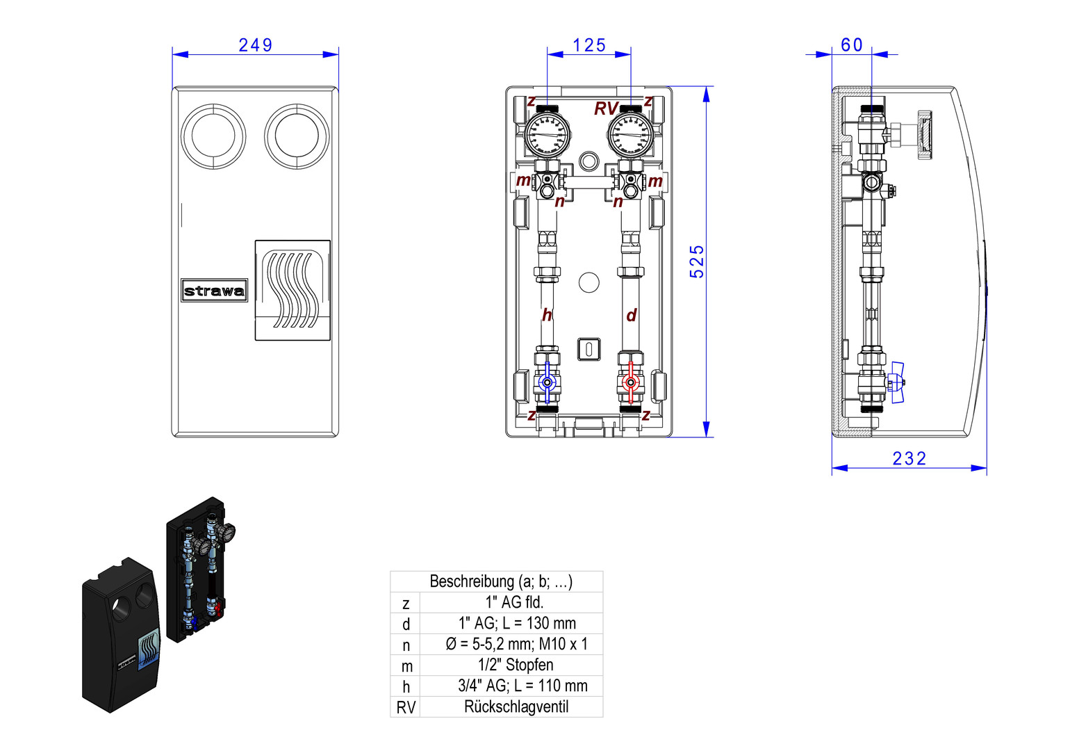passend auf strawi 125-25 Kesselverteiler, bestehend aus Thermometer-Kugelhähnen DN 25 im Vor- und, Rücklauf 0-120°C, zusätzlich mit Pumpenkugelhahn im Vorlauf (bei Wärmezählerverrohrung zusätzlicher Kugelhahn im Rücklauf), Rückschlagklappe im Vorlaufkugelhahn, mit oder ohne Wärmezählerverrohrung Länge 110 mm, 2 x 3/4“ AG oder Länge 130 mm, 2 x 1“ AG und Fühlereinbaustücke 5-5,2mm, M10x1 im Vor- und Rücklauf montiert, Pumpendistanzstück bzw. Pumpe, mit EPP-Wärmedämmung, max. Volumenstrom 0,86 cbm/h (20 kW, bei Delta T= 20 K, max. Betriebstemperatur 100°C, max. Betriebsdruck 6 bar, Stutzenabstand 125 mm, 249 x 525 x 232 mm, Primäranschluss 1“AG flachdichtend, Sekundäranschluss 1“AG flachdichtend