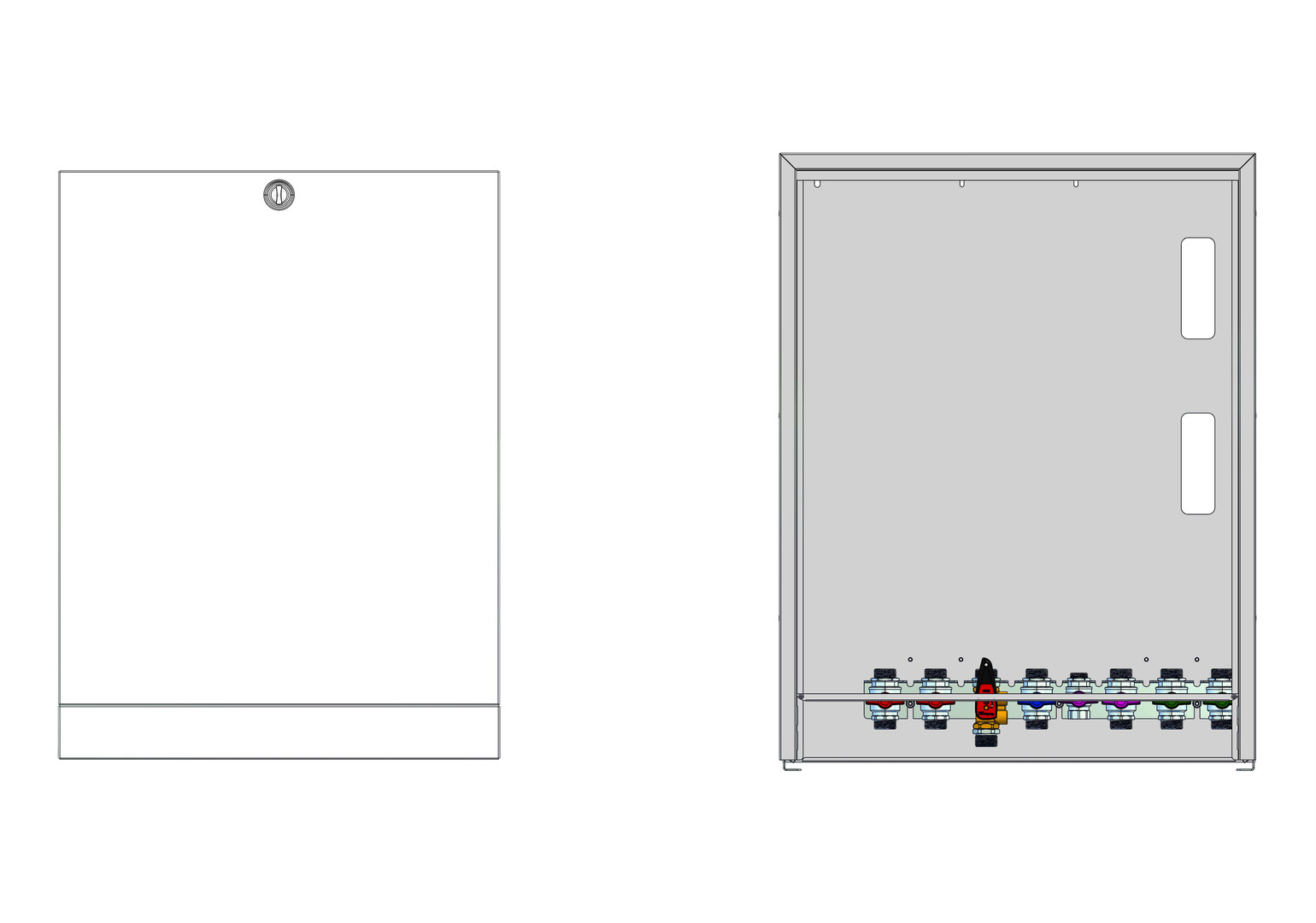 für statische Heizfläche, Schrank bestehend aus: Aufputz-, aus feuerverzinktem Stahlblech und alle sichtbaren Teile in Weiß RAL 9016, alle Halterungen mit Schalldämmeinlage, AP-Schrank: 706 x 916 x 180 mm, Anschlussleiste bestehend aus: Kugelhähne DN 25 (1" AG flachdichtend), Zirkulationskugelhahn DN 20 (3/4" IG), Anschlussleiste 7-fach: SVL-PVL-PRL-SRLTWW-ETWK-ATWK, Anschlussleiste 8-fach mit Zirkulation (Z): SVL-PVL-PRL-SRL-Z-TWW-ETWK-ATWK, Primär-Rücklauf optional mit Strangregulierventil (SRV) Ballorex Vario, Filterkugelhahn im Primär-Vorlauf