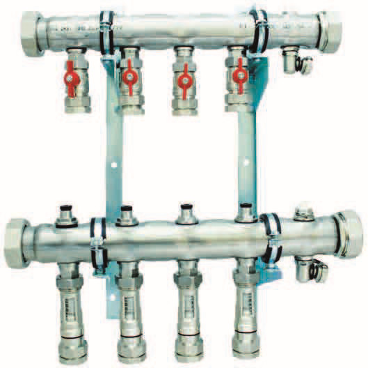 gewährleistet den hydraulischen Abgleich über manuell einstellbare integrierte Regulierventile und Durchflussanzeiger im Rücklauf, zusätzliche Absperrung im Vorlauf und Klemmverschraubungsanschluss, max. Wärmeleistung 75 kW bei delta T 10 K, max. Volumenstrom von 6,44 m³/h, max. Betriebstemperatur 90 °C, max. Betriebsdruck 10 bar, bestehend aus Vor- und Rücklaufbalken des profiliertem Edelstahlprofil DN 50, Stutzenabstand 80 mm, SFE-Ventil und Entlüftungsventil im VL- und RL-Balken, VL-Balken mit angehangenen Kugelhähnen DN 25 mit Klemmverschraubung Ø 32 mm, RL-Balken mit integrierten Regulierventilen (Kvs= 4,16 m³) und Durchflussanzeigern 4-15 l/min (10-40 l/min auf Anfrage) und Klemmverschraubungen Ø 32 mm, Primäranschluss: 2" ÜW flachdichtend, Anschluss wahlweise von links oder rechts, Sekundäranschluss: Klemmverschraubung Ø 32 mm für PE- und PVC-Rohre, Befestigung: 2 verzinkte Wandkonsolen mit Befestigungsschellen mit Schalldämmeinlage (erfüllt DN 4109) mit Schrauben und Dübel, Abstand der Vor- und Rücklaufverteilerbalken 300 mm