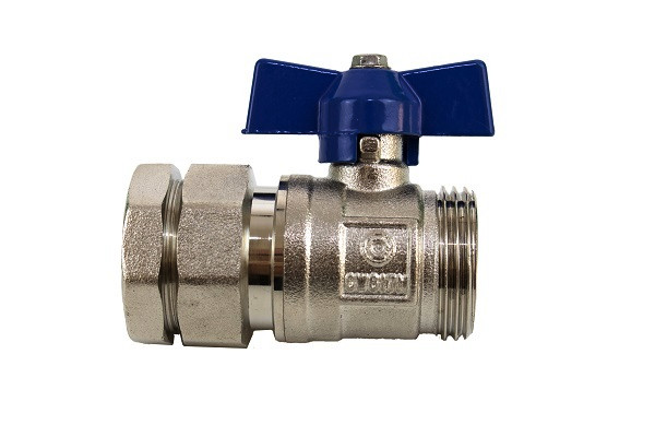 Messing, 1" AG flachdichtend mit Klemmverschraubung, mit blauem Flügelgriff, für Industrie- und Soleverteiler e-class, Länge: KLV 25= 72 mm, KLV 32= 78 mm