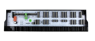 zum Verteilen der Versorgungsspannung, der Stellsignale und eines gemeinsamen Zeitprogrammes für Raumgeräte und thermische Antriebe, zum Heizen und Kühlen mit Absenkung, Betriebsspannung 230 VAC, mit Ausgang Pumpensteuerung über ein Pumpenmodul, Eingang Heizen/Kühlen, Eingang TB oder rH% und Eingang Eco-Betrieb auf 2 Zonen, für max. 18 Stellantriebe