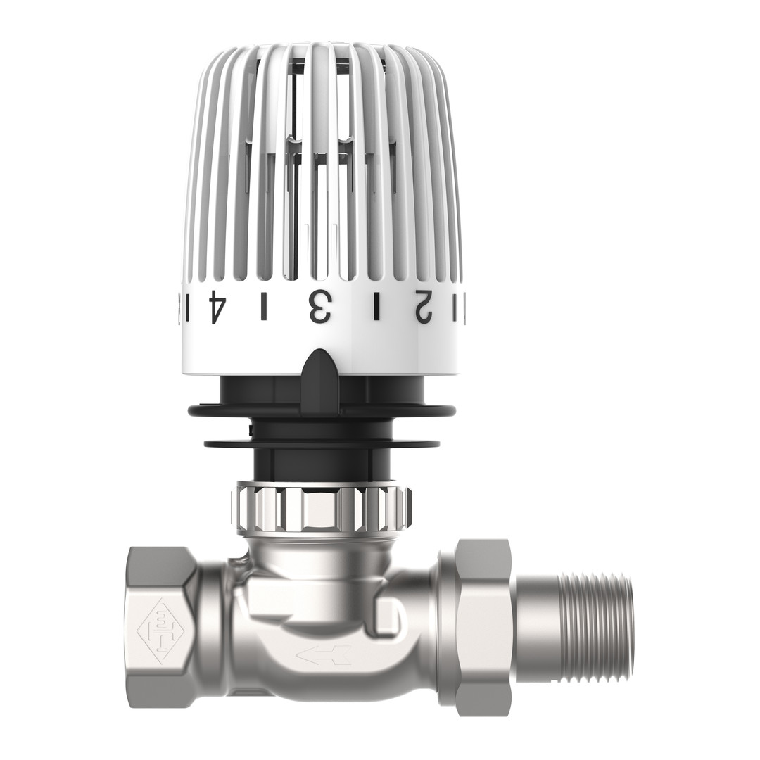 Ventilunterteil mit Dehnstoff gefülltem Thermostatkopf Fabrikat Heimeier in weiß, Eingang 1/2" AG (Verschraubungstülle), Ausgang 1/2" IG