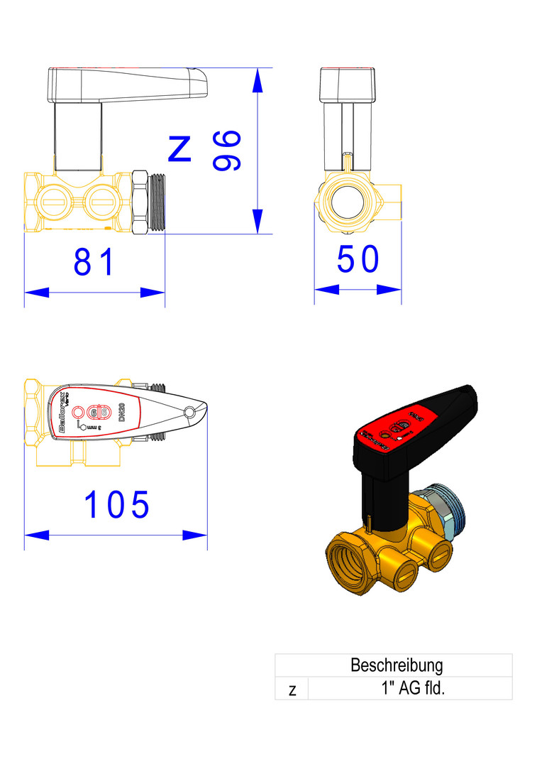 mit Anschlussnippel auf 1" AG flachdichtend für den Anschluss am e-class Verteiler (DN 15 kvs=1,71, DN 20 kvs=4,4)