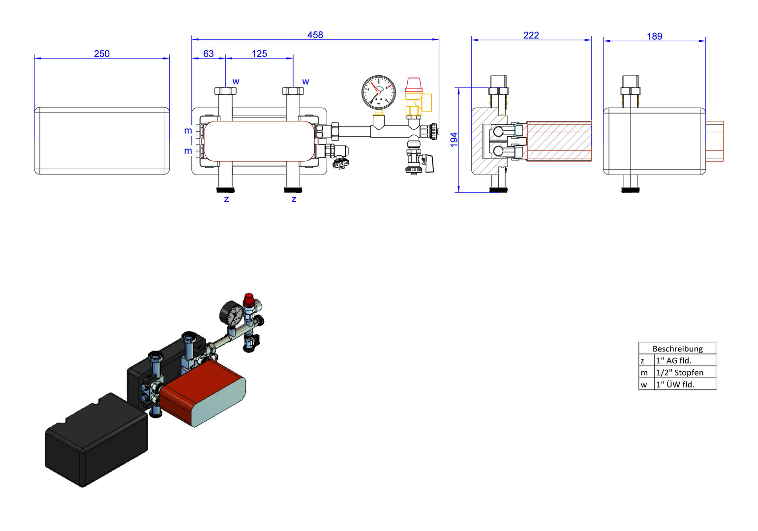 für hydraulische und/oder medium getrennte Heizkreise (z.B für Frostschutzanwendungen, Schutz der Anlage gegen Sauerstoffeintrag), kupfergelöteter Plattenwärmeübertrager, Verrohrung aus Edelstahl 1.4301, Sicherheitsgruppe (mit Manometer 0-4 bar, Sicherheitsventil DN 15 2,5 bar, SFE-Ventil und Anschluss 3/4" AG mit Kappe verschlossen für bauseitiges MAG) und EPP-Dämmung gemäß GEG mit Ausschnitten für Verteileranschlüsse, max. Betriebsdruck 6 bar, max. Betriebstemperatur 100°C, Leistung 5/10/15/20, bzw. 30 kW Leistungsangaben bei Primär: (VL/RL) 70/50°C, Sekundär (RL/VL) 37/45°C, Stutzenabstand 125 mm, Einbaulänge 172 mm, Wärmedämmung 250 x 125 x 195 mm, Sekundärseite 2 x 1“ Überwurfmutter flachdichtend, passend für strawi 125-25 Aufbaugruppe