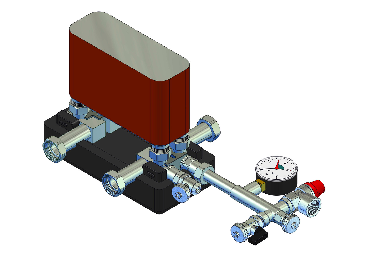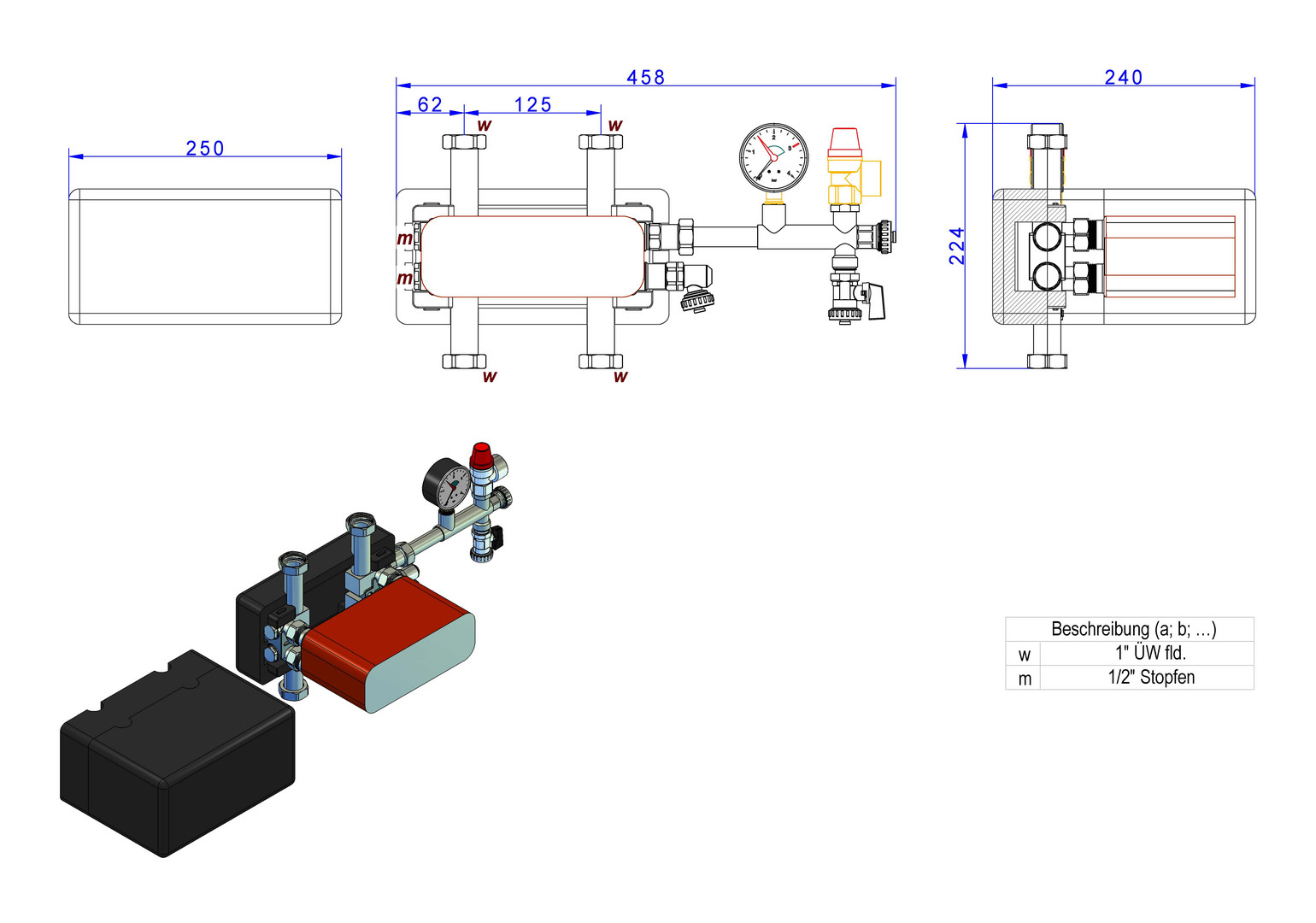 für hydraulische und/oder medium getrennte Heizkreise (z.B für Frostschutzanwendungen, Schutz der Anlage gegen Sauerstoffeintrag), kupfergelöteter Plattenwärmeübertrager, Verrohrung aus Edelstahl 1.4301, Sicherheitsgruppe (mit Manometer 0-4 bar, Sicherheitsventil DN 15 2,5 bar, SFE-Ventil und Anschluss 3/4" AG mit Kappe verschlossen für bauseitiges MAG) und EPP-Dämmung gemäß GEG mit Ausschnitten für Verteileranschlüsse, max. Betriebsdruck 6 bar, max. Betriebstemperatur 100°C, Leistung 5/10/15/20, bzw. 30 kW Leistungsangaben bei Primär: (VL/RL) 70/50°C, Sekundär (RL/VL) 37/45°C, Stutzenabstand 125 mm, Einbaulänge 172 mm, Wärmedämmung 250 x 125 x 195 mm, Sekundärseite 2 x 1“ Überwurfmutter flachdichtend, passend für strawi 125-25 Aufbaugruppe