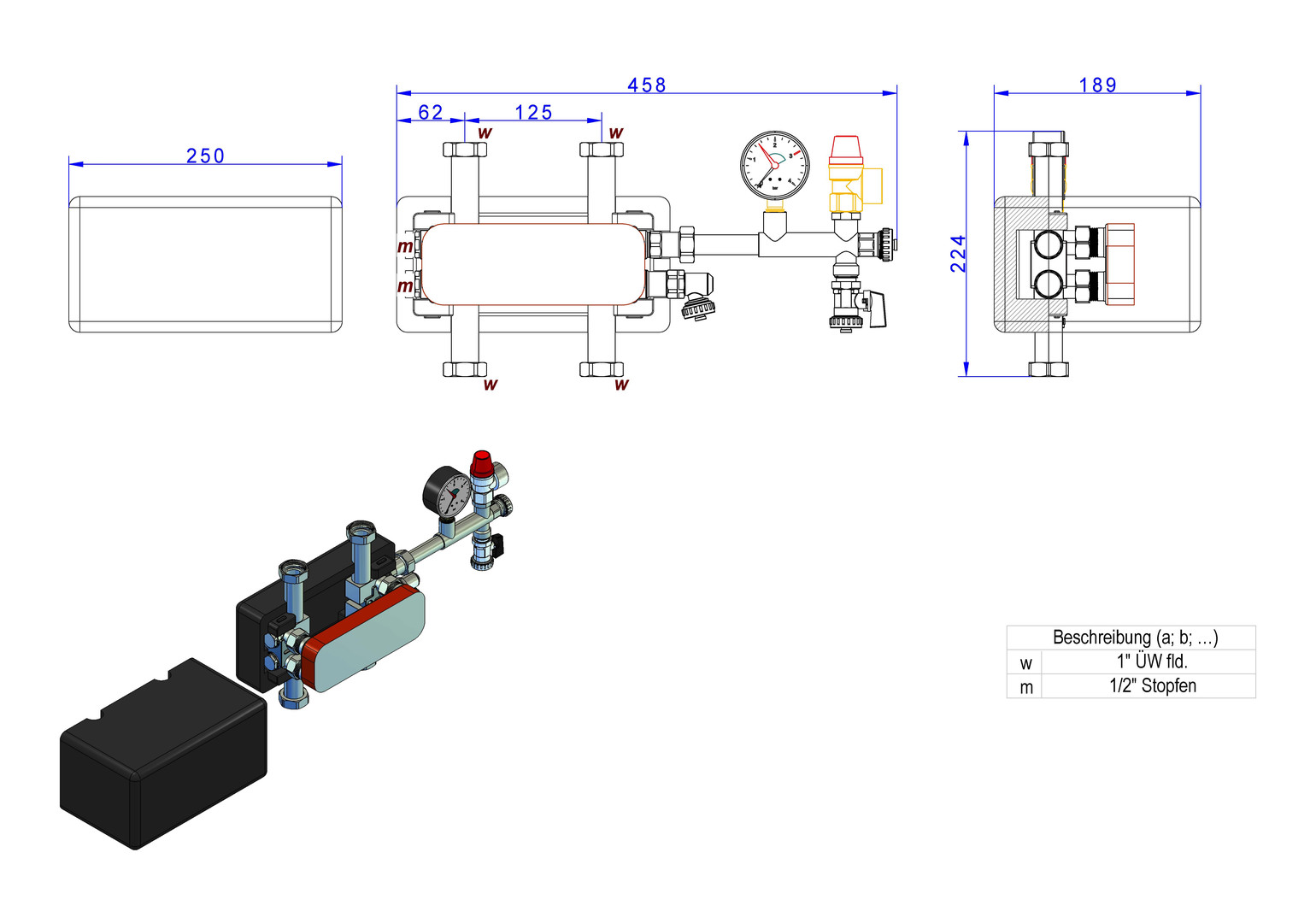 für hydraulische und/oder medium getrennte Heizkreise (z.B für Frostschutzanwendungen, Schutz der Anlage gegen Sauerstoffeintrag), kupfergelöteter Plattenwärmeübertrager, Verrohrung aus Edelstahl 1.4301, Sicherheitsgruppe (mit Manometer 0-4 bar, Sicherheitsventil DN 15 2,5 bar, SFE-Ventil und Anschluss 3/4" AG mit Kappe verschlossen für bauseitiges MAG) und EPP-Dämmung gemäß GEG mit Ausschnitten für Verteileranschlüsse, max. Betriebsdruck 6 bar, max. Betriebstemperatur 100°C, Leistung 5/10/15/20, bzw. 30 kW Leistungsangaben bei Primär: (VL/RL) 70/50°C, Sekundär (RL/VL) 37/45°C, Stutzenabstand 125 mm, Einbaulänge 172 mm, Wärmedämmung 250 x 125 x 195 mm, Sekundärseite 2 x 1“ Überwurfmutter flachdichtend, passend für strawi 125-25 Aufbaugruppe
