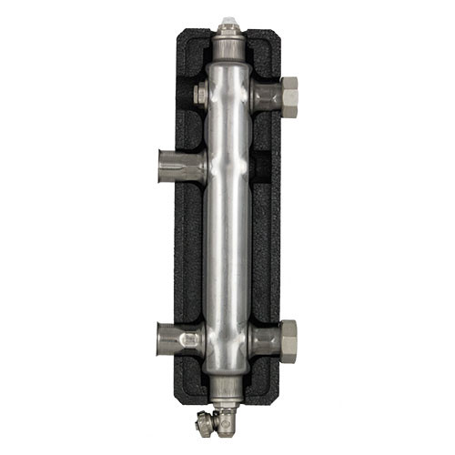 für Kleinkesselanlagen, aus Edelstahlspezialprofil 1.4301 DN 50, mit 4 Anschlussstutzen für Vor- und Rücklauf mit O-Ringdichtung, 1/2" Fühlermuffe, 1/2" Entlüftungsventil und SFE-Ventil (Spül-, Füll- und Entleerungsventil), EPP- Wärmedämmung entsprechend GEG, komplett im Schutzkarton verpackt, max. Betriebsdruck 6 bar, max. Betriebstemperatur 80 °C, max. Volumenstrom 3 cbm/h, (bei v= 0,41 m/s-entspricht ca. 79 kW bei Delta T= 20 K)