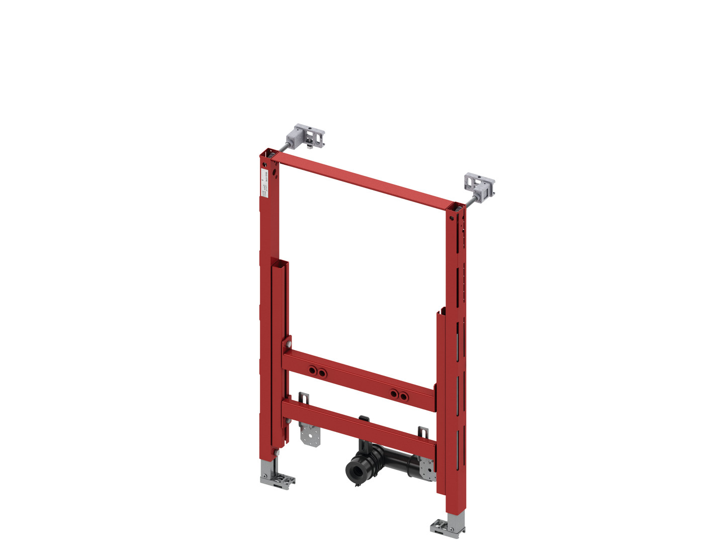 zur Befestigung an TECEprofil-Profilrohren, für den Einbau in Metall- oder Holzständerwände, als Vorwand- oder Eckmodul, komplett vormontierte Einheit bestehend aus selbsttragendem Montagerahmen mit pulverbeschichteter Oberfläche und 2 verstellbaren Fußstützen für einen Fußbodenaufbau von 0-200 mm, 2 Haltebolzen und Muttern M 12, stufenlos höhenverstellbarem Abwasseranschluss, Anschlussbogen DN 40/50 mit Gummimanschette NW 30/50 (zugleich Dichtung) mit Bauschutzstopfen, 2 tiefenverstellbare Modulbefestigunge, in Kombination mit der Teleskopbefestigung 9380001 auch für die Bauhöhe 980 mm in einer TECEprofil-Vorwand einsetzbar