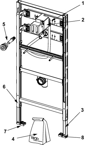 zur Aufnahme von manuellen und elektronischen Betätigungssystemen, zur Befestigung an TECEprofil-Profilrohren oder für den Einbau in Metall- oder Holzständerwände und als Vorwand- oder Eckmodul, komplett vormontierte Einheit bestehend aus TECE Urinalspülergehäuse mit Vorabsperrung und Rohbauschutz, Anschluss Rp 1/2, 2 verstellbaren Fußstützen für einen Fußbodenaufbau von 0-200 mm, 2 Haltebolzen M 8, stufenlos verstellbarer Befestigungsschiene, stufenlos höhenverstellbarem Abwasseranschluss, Anschlussbogen DN 50 mit Bauschutzstopfen, Befestigungsmaterial für Urinal und Einlaufgarnitur