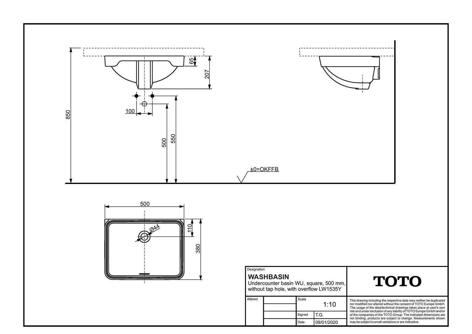TOTO Unterbauwaschtisch WU 50x38x20,7cm, ohne Hahnloch, mit Überlauf, eckig, weiß