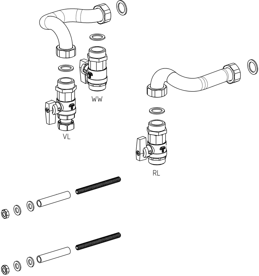 Kugelhähne und Wellschlauch-Set zur direkten Montage an den PFW-mux Systemspeicher, für Speicherstutzen G1