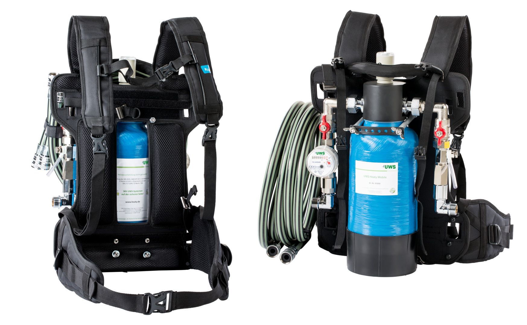 kompaktes Füllgerät mit Rucksacksystem, transportabel zum Befüllen von Etagenheizungen, Kapazität bei 420 µS/cm auf <100 600 l, Spannungsversorgung 230 V, Gewicht ca. 9 kg, Inhalt Mischbett 4 l