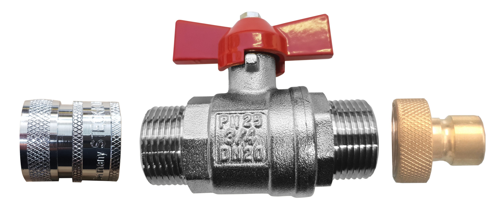 bestehend aus Gewindestecker verchromt, Kugelhahn 3/4", 2x AG Steckkupplung