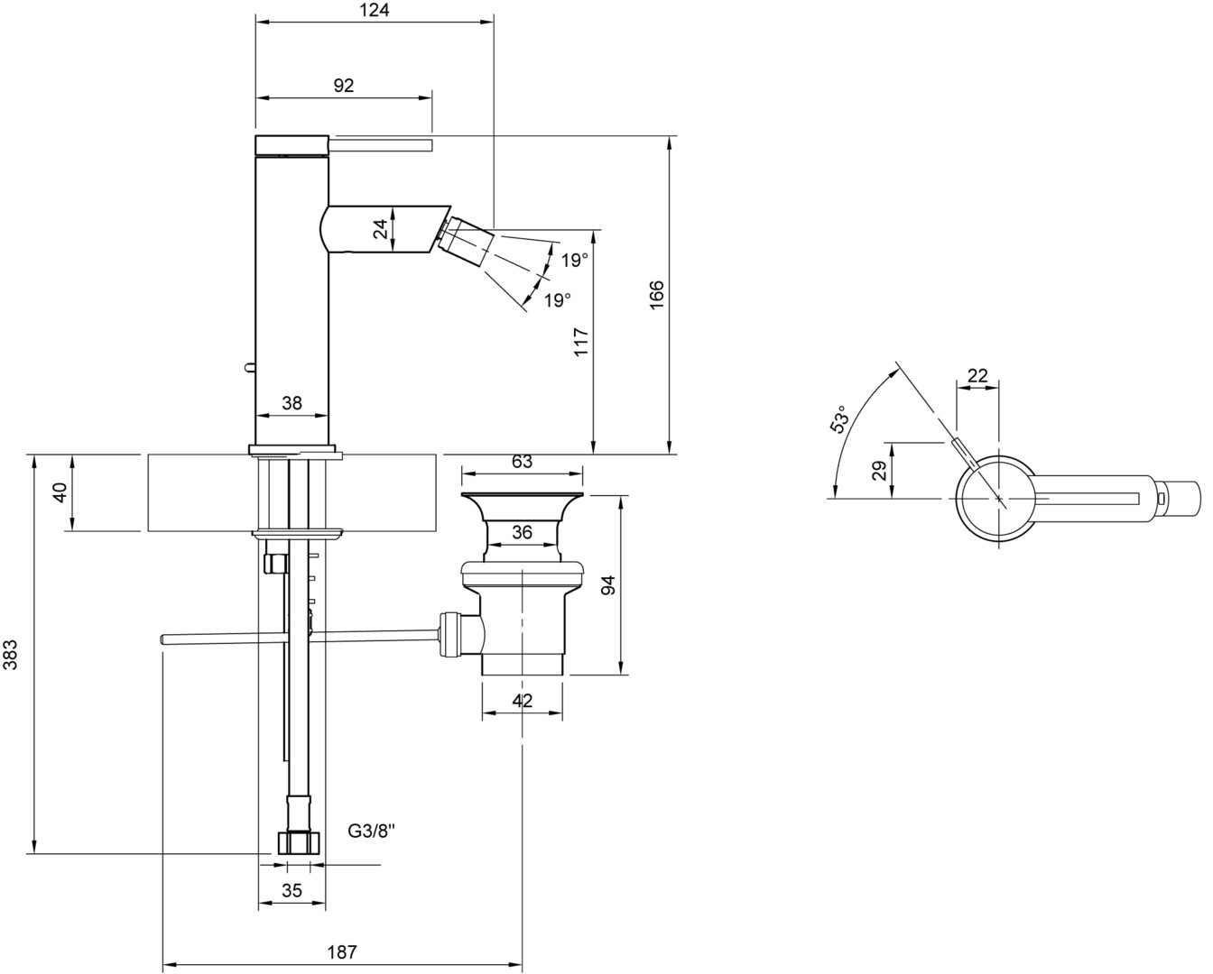 38 x 166 x 124 mm, Rund, Standmontage, bestehend aus: 1 x Armatur, 1 x Strahlregler Schlüssel, 1 x Ablaufgarnitur, 1 x Befestigung, 2 x Anschlussschläuche, 1 x Montageanleitung, Kippen, Material aus Messing, Durchflussmenge: 7,9 l/min
