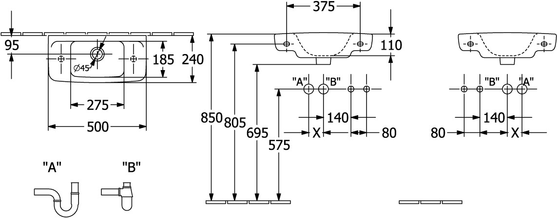 V&B Handwaschbecken Newo eckig, mit Überlauf, 50x24cm, mitte, weiß W37588