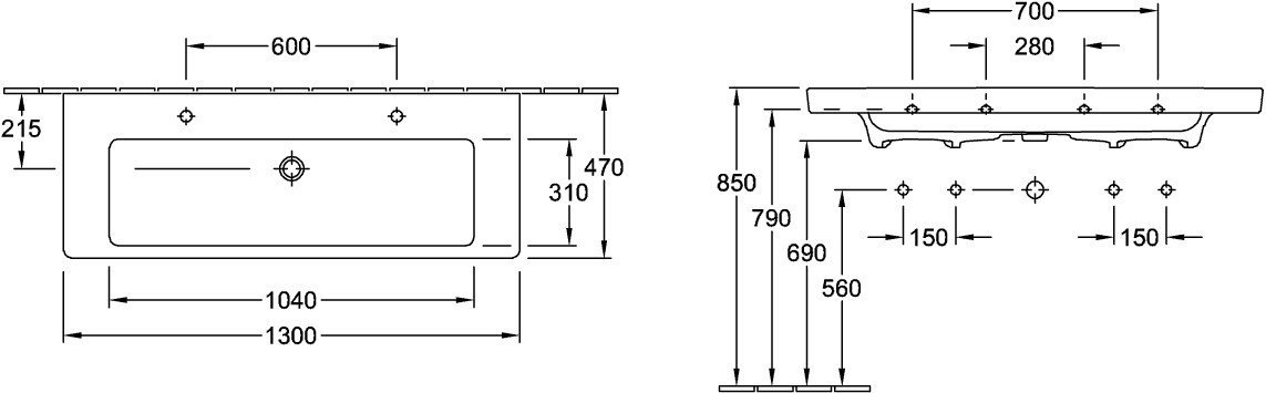 V&B Möbel-Waschtisch Subway 2.0 weiß C-plus, 130x47cm, 2 Hahnlöcher, Überlauf