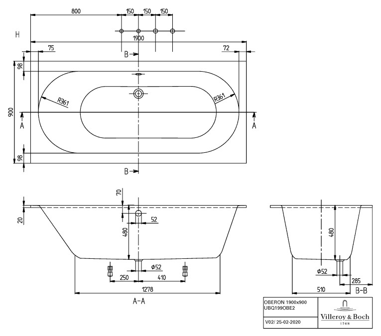 V&B Rechteck-Badewanne Oberon 190x90cm, Ablauf mittig, Quaryl, weiß