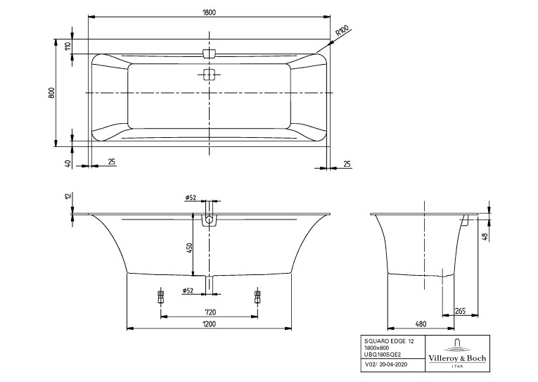 V&B Rechteck-Badewanne Squaro Edge 12 Duo 180 x 80 cm, weiß, Ablauf mittig, Quaryl 263329