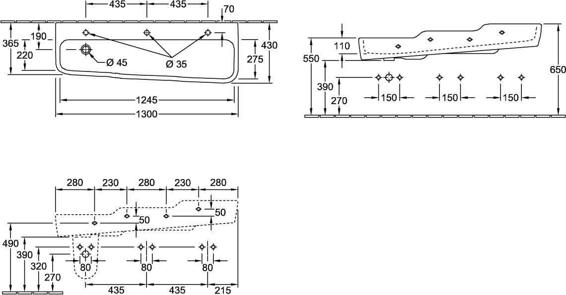 V&B Reihenwaschtisch O.NOVO KIDS 130 x 43 cm, für 3x 1-Loch Armaturen, ohne Überlauf, weiß C-plus