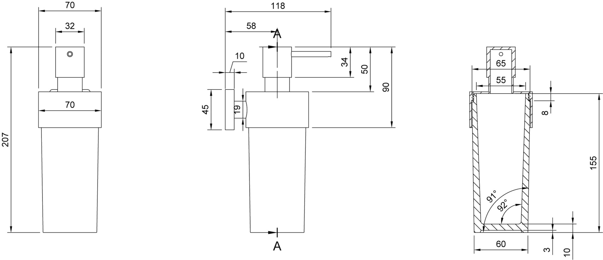 70 x 207 x 121 mm, Eckig, Wandmontage, Material aus Messing, Behälter aus satiniertem Glas